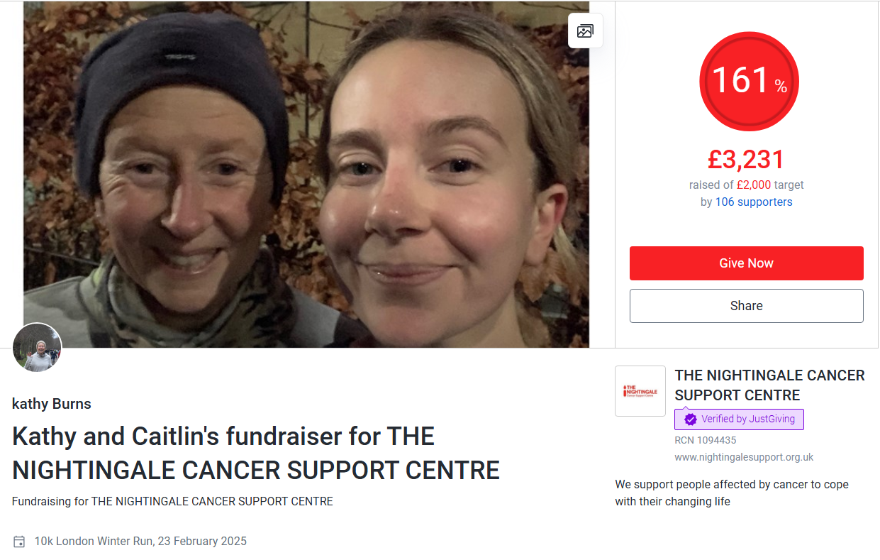 On Sunday February 23rd I completed the 10k London Winter Run in 69 minutes! Together with my daughter Caitlin, we raised over £4,000 (including gift aid) for The Nightingale.