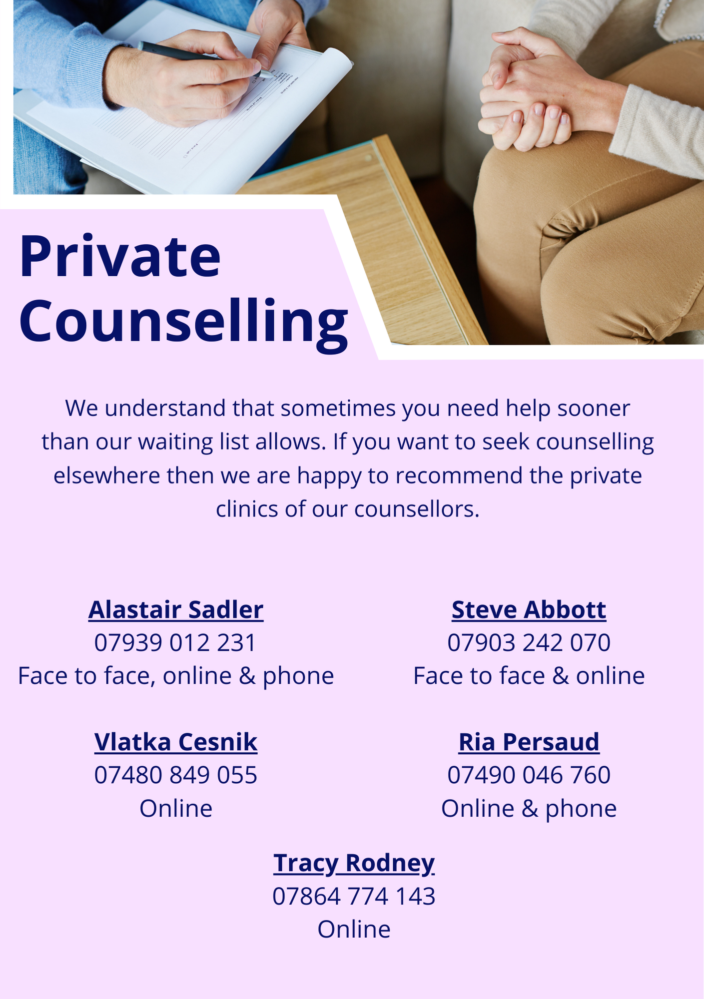 We understand that sometimes you need help sooner than our waiting lists allow, so we are happy to recommend the private clinics of our counsellors.